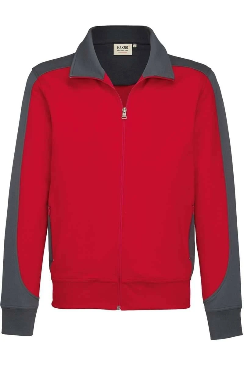 Wunderschönes HAKRO Comfort Fit Sweatjacke in der Farbe rot/anthrazit, Zweifarbig. Ein tolles, vielseitig kombinierbares Kleidungsstück von HAKRO, das sehr angenehm zu tragen ist. Das Material ist 50% Baumwolle / 50% Polyester.