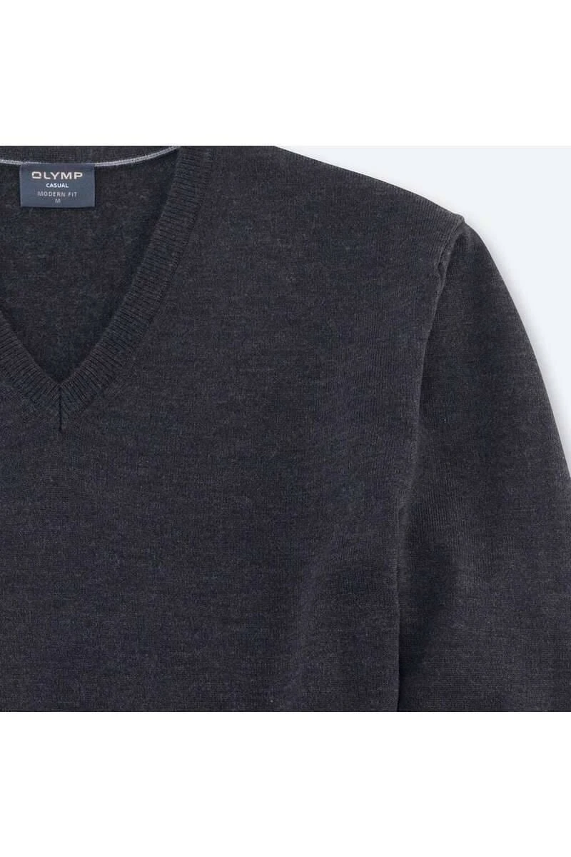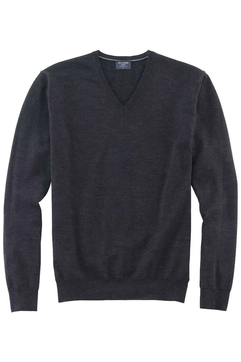 Hochwertiger Olymp-V-Ausschnitt aus 100% Merinowolle in klassischer Passform, Farbe graphit – Einfarbig. Die hervorragende Verarbeitung bietet höchsten Tragekomfort und sorgt für eine tolle Formstabilität. Der Pullover kann durch seine spezielle Verarbeitung der Wolle sogar in der Waschmaschine gewaschen werden.